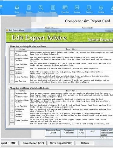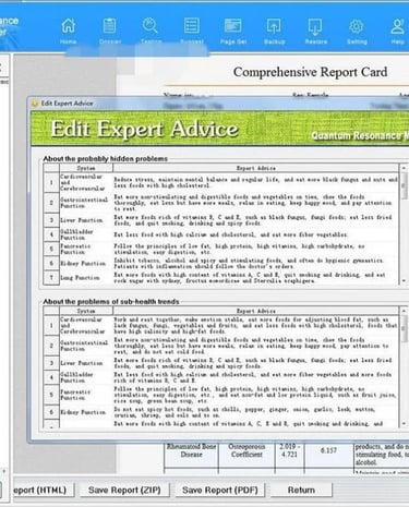 القلب والأوعية الدموية والأوعية الدموية في الدماغ | الجهاز الهضمي | الكبد | المرارة | البنكرياس | الكلى | الرئة | الدماغ والأعصاب | أمراض العظام | كثافة العظام | مرض الروماتويد العظمي | سكر الدم | تكوين الجسم الأساسي | السموم | العناصر النزرة | الجهاز الصماء | الجهاز المناعي | البروستاتا | الوظيفة الجنسية للذكور | الجلد | الأحماض الأمينية | المعادن الثقيلة | مسببات الحساسية | العين | السمنة | معادن العظام | القنوات والقنوات الناقلة | السائل المنوي والسائل المنوي | نبض القلب والدماغ | دهون الدم | عناصر جسم الإنسان | الثدي | أمراض النساء | الدورة الشهرية.